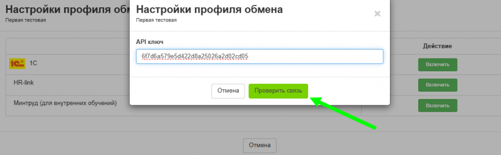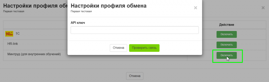 В открывшемся окне при попытке включить профиль обмена «Минтруд (для внутренних обучений)» Софт запросит ввести API ключ: