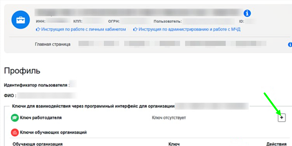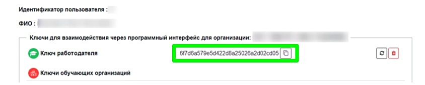 Далее во вкладке «Ключи для взаимодействия через программный интерфейс для организации» нажмите на иконку «плюс», чтобы получить ключ работодателя: