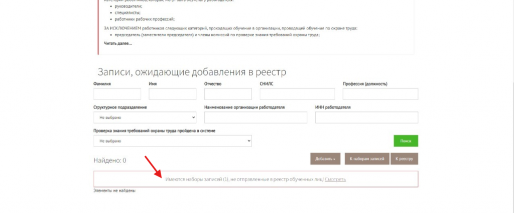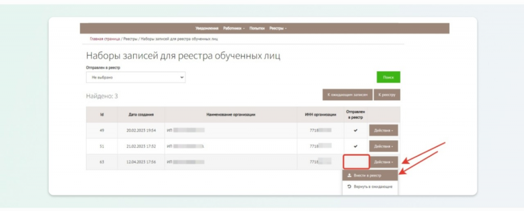 Далее администратор выбирает нужные записи и отправляет их в реестр обученных лиц. Иными словами, из набора нужно перенести выбранные записи в ожидающие добавления вручную: