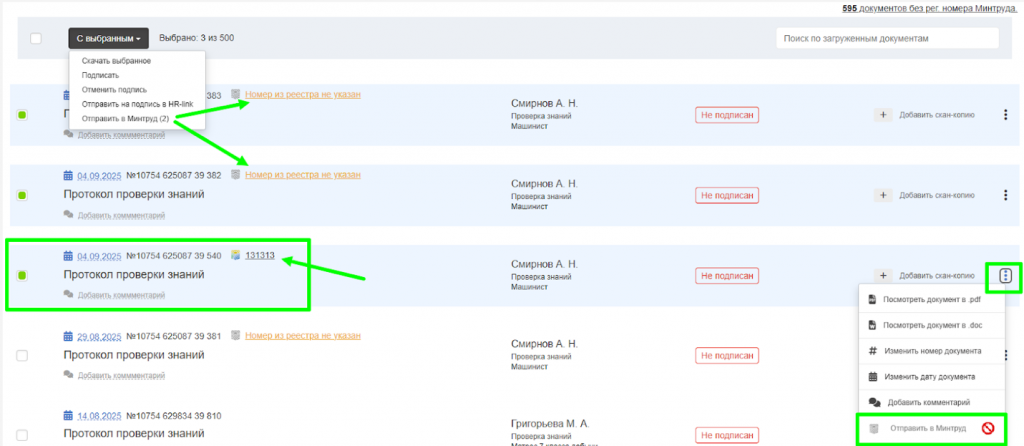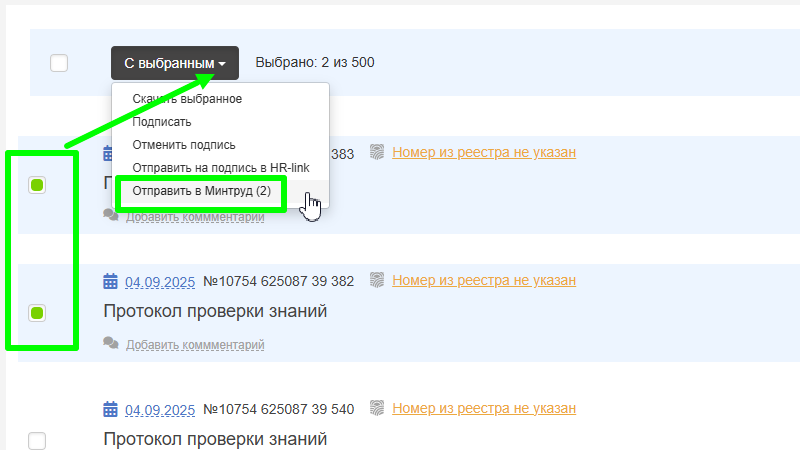 Второй – выбрать один или несколько документов, нажать «С выбранными» и далее «Отправить в Минтруд (количество выбранных документов)».
