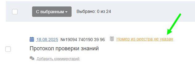 У протоколов, подлежащих отправке, есть признак «Номер из реестра не указан». Это означает, что для программ, по которым выпущены данные документы, установлено соответствие с программой из реестра Минтруда.