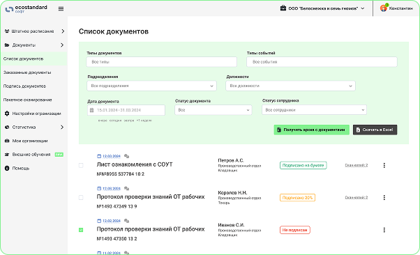 В случае отказа от использования EcoStandard.soft вы сможете скачать все созданные документы и реестры персонала вместе с историей созданной на них документации и пройденных обучений.